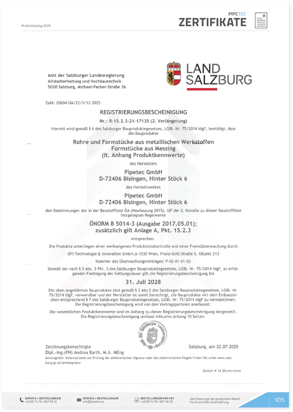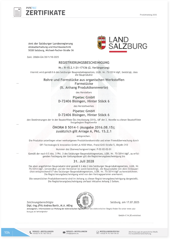 ZERTIFIKATE FÜR PIPETEC ROHRE UND FITTINGS